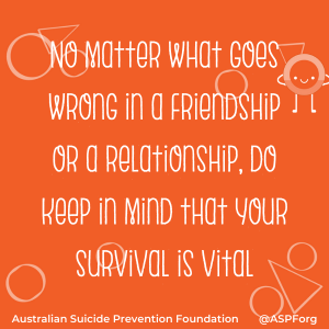 No matter what goes wrong in a friendship or a relationship, do keep in mind that your survival is vital. If a friend of yours had a fatal medical illness, they would not want you to die also. If something disastrous happens between you and another person, you know that other person would not want you to die either. If you had a major fallout with a friend or someone with whom you were having a relationship, you would not want the other person to die!