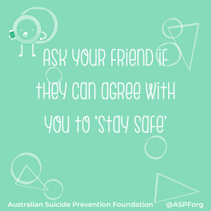 This is the point where you can assess if you need to get more help: Ask your friend if they can agree with you to ‘stay safe’ for an agreed period of time. This can be any time that you can agree. If they can’t